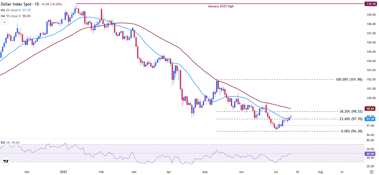 The DXY has staged a modest rebound from its July 1 low at 96.38, but it continues to trade below the 98.00 psychological resistance level. Price action is currently testing the 20-day Simple Moving Average (SMA) at 97.70, while the 50-day SMA at 98.84 remains intact as a key level of resistance.