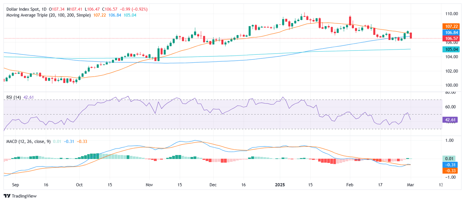 The US Dollar Index (DXY) turns lower, slipping below the 20-day and 100-day Simple Moving Averages (SMA), which are nearing a bearish crossover around the 107.00 level. Momentum indicators such as the Relative Strength Index (RSI) and Moving Average Convergence Divergence (MACD) are reinforcing the negative outlook. Key support levels emerge at 106.00 and 105.50, while 107.00 remains the first resistance level should the index attempt a rebound. However, with fundamental and technical factors aligning to the downside, further weakness is likely in the short term.