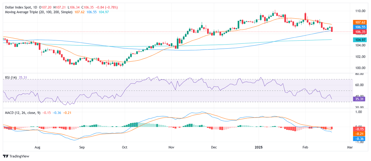 The US Dollar Index remains under pressure after falling below 106.50, with bearish momentum gaining traction. The index struggles to reclaim the 20-day Simple Moving Average (SMA), signaling continued weakness. Both the Relative Strength Index (RSI) and Moving Average Convergence Divergence (MACD) remain entrenched in negative territory, suggesting persistent downside pressure. A decisive drop below the 100-day SMA at 106.30 could signal a further bearish breakout, with 106.00 emerging as the next significant support level. Bulls need to reclaim the 107.50 resistance zone to shift momentum in their favor.