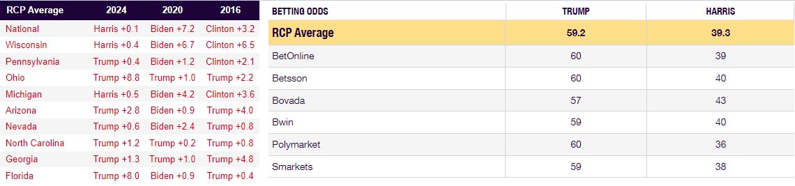 In the meantime, US presidential election betting odds point to a Donald Trump victory. RealClearPolling's average for betting odds currently has Trump at 59.2 and Harris at 39.3.
