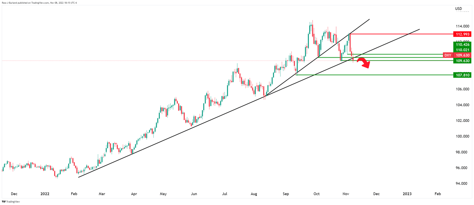 The US Dollar is testing a key trendline support structure as the chart above illustrates.