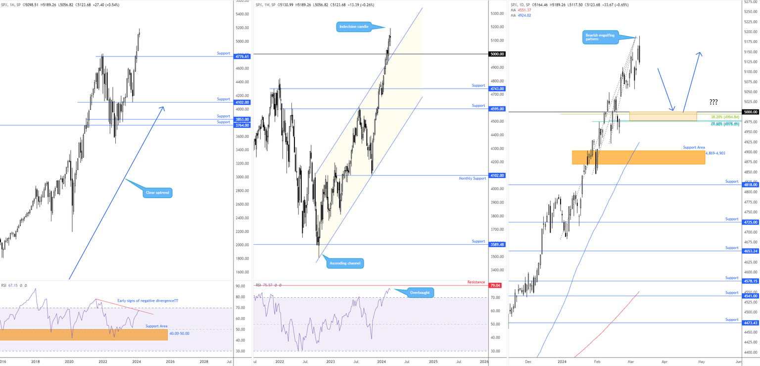 Therefore, if a correction unfolds and we test the 5,000 region this week, dip buyers seeking entry into the current uptrend will have a support zone to work with between 4,976 and 5,000, bolstered by potential weekly channel support.