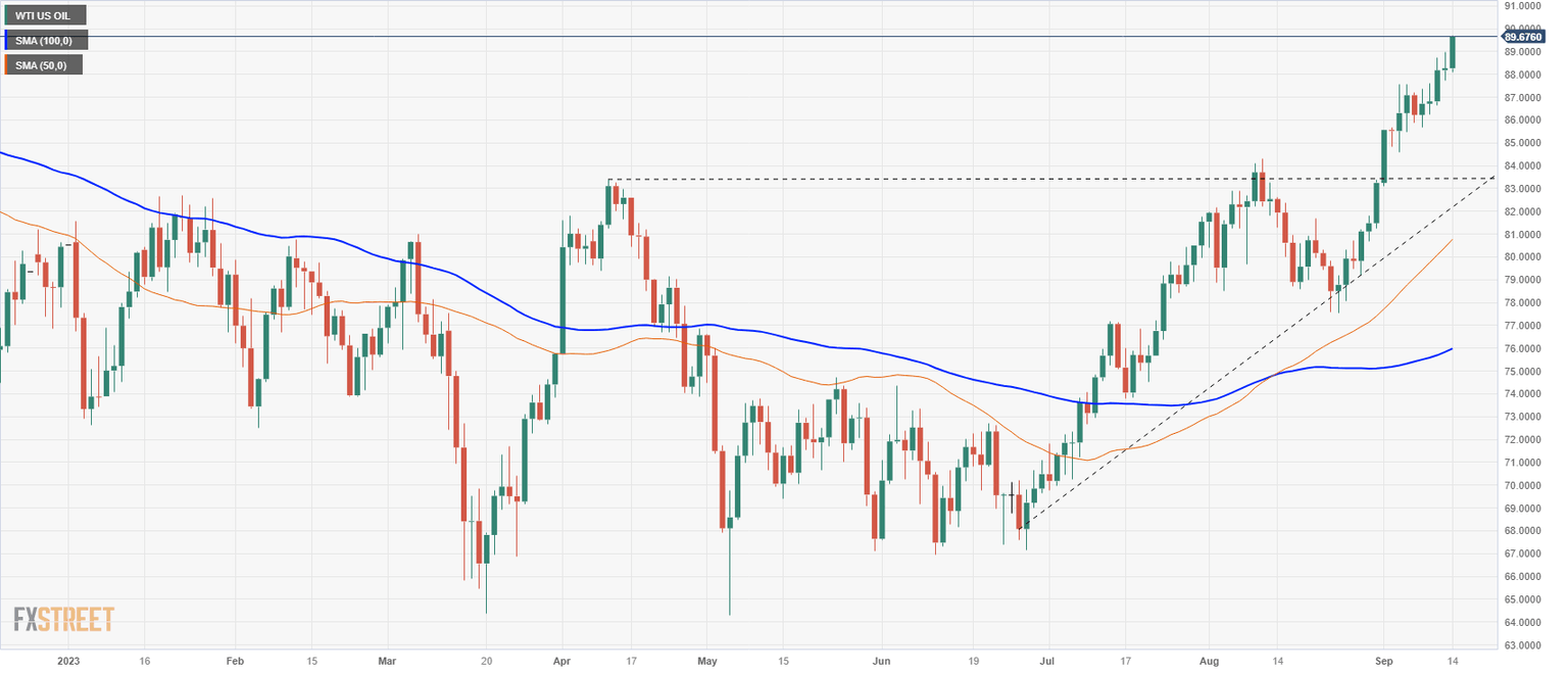 US Oil rallying into ten-month highs, WTI knocking on the ceiling near $90.00