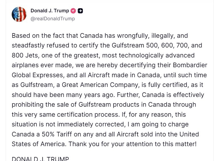 US President Donald Trump on Thursday threatened to impose a 50% tariff on all aircraft sold from Canada into the United States (US), accusing Canada of unfairly blocking certification of Gulfstream business jets.