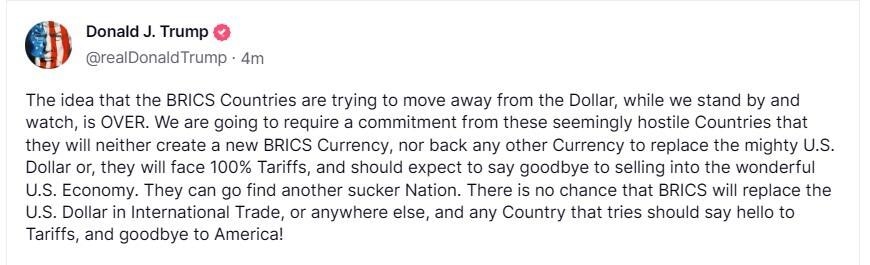 US President Trump warns of potential 100% tariffs if BRICS attempt to replace US Dollar