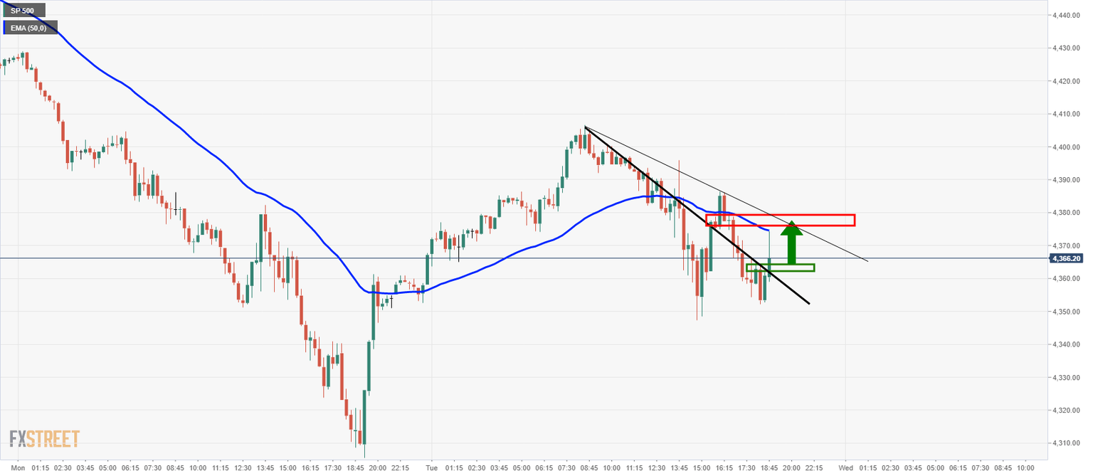 Traders are testing the 15-min 50-EMA that meets a critical level of resistance ahead of the close. 4,380 is in focus.