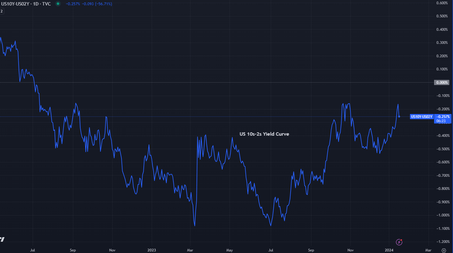 At the beginning of the week, investors were expecting 175 basis points of rate cuts by the Fed in 2024. But throughout the session, they adjusted their bets, and now expect 145 basis points of monetary easing, which means they trimmed one rate cut.