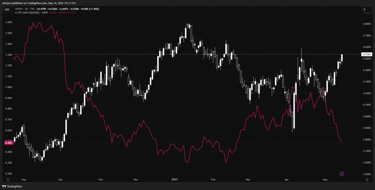 10-year yield rises to 4.525% while real yields surge to 2.21%, as Fed officials flag tariff risks and easing bets fade