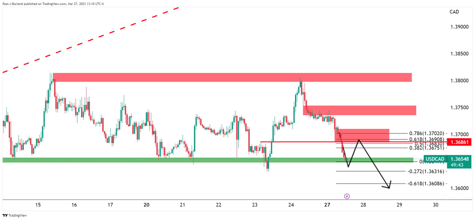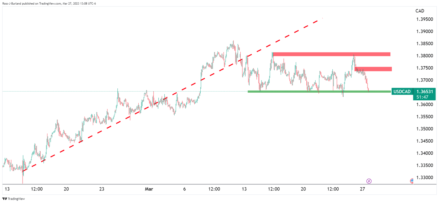 USD/CAD was down some 0.6% at the time of writing, losing space from a high of 1.3745 and reaching a low of 1.3649 on the day so far. The financial system was calmed after First Citizens BancShares said it would take on the deposits and loans of failed Silicon Valley Bank, supporting a risk-on mood. Additionally, the price of oil, a major Canadian export, settled 5.1% higher at $72.18 a barrel on hopes that banking sector issues would be contained, supporting the Loonie.