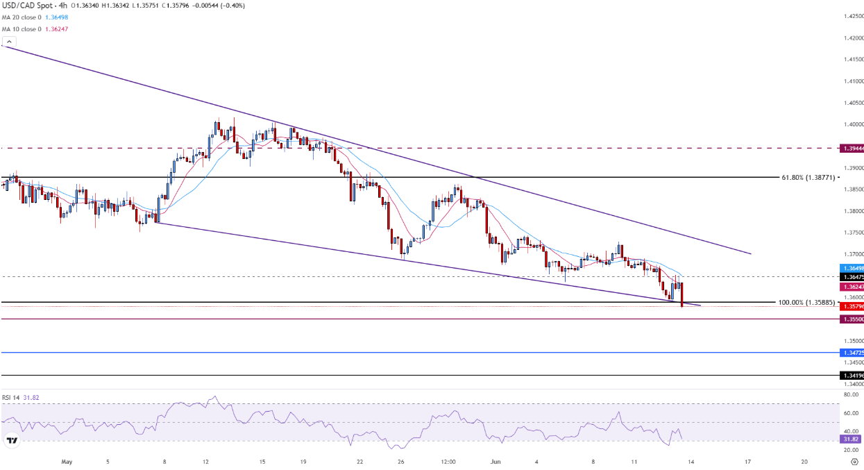 USD/CAD is approaching the support level of 1.3588, which corresponds to the base of a falling wedge pattern on the four-hour chart. This level has now become near-term resistance, contributing to bearish momentum.