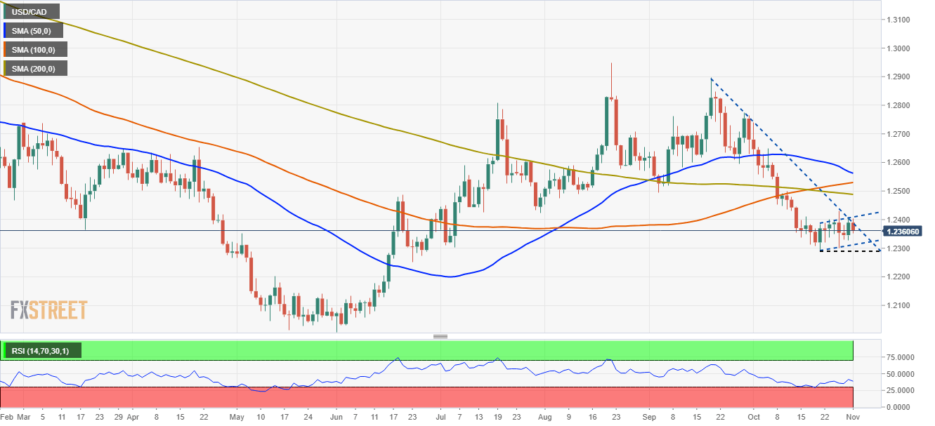 On the macroeconomic front, the Canadian economic docket featured the IHS Markit Manufacturing PMI for October rose to 57.7, better than the 57.2 expected and higher than the September reading. That motivated CAD bulls, which promptly spurred a downward move towards the 1.2350 familiar level, but lacked the conviction to push the pair towards 1.2300, as the Federal Reserve November meeting, is around the corner.