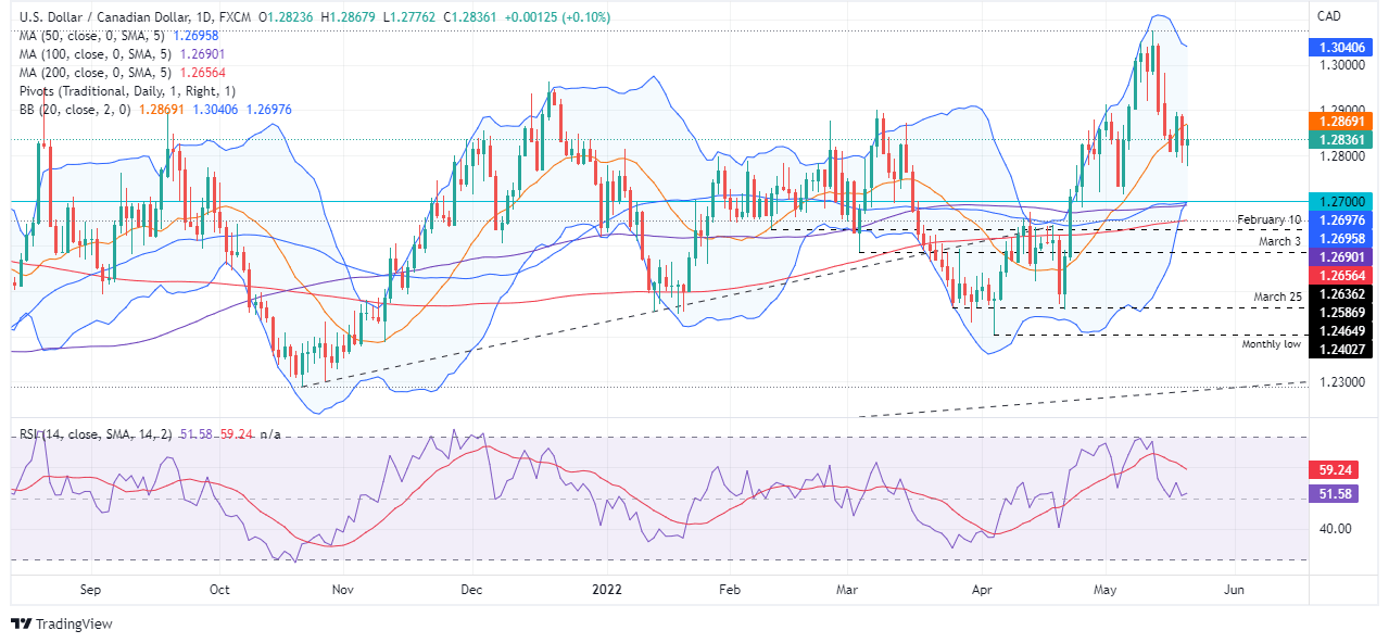 That said, the USD/CAD first resistance would be the 20-DMA at 1.2869. Break above would expose the 1.2900 mark, followed by the May 16 daily high at 1.2981, then the figure at 1.3000. On the flip side, the USD/CAD first support would be 1.2800. Once cleared, the next demand zone would be the April 29 daily low at 1.2718, followed by the confluence of the 50 and 100-DMA at 1.2695 and 1.2690, respectively.