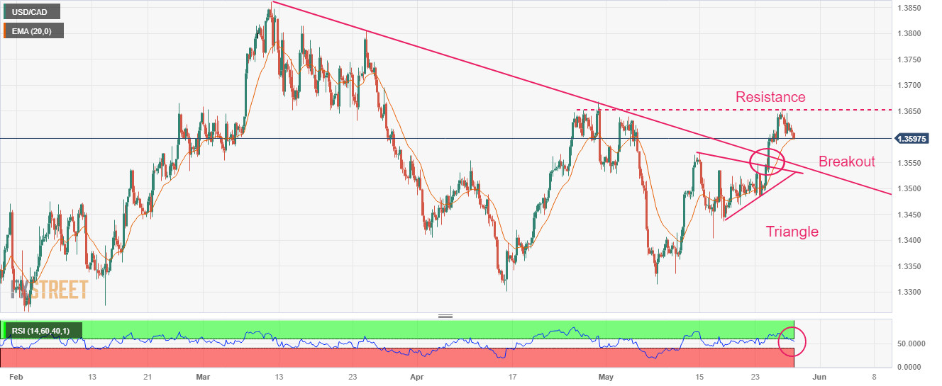 USD/CAD has shifted its auction below the round-level support of 1.3600 in the early European session. The Loonie asset has faced intensive selling pressure after a sharp decline in appeal for the US Dollar Index (DXY). The USD Index lost its appeal after US President Joe Biden comprised the scale of spending initiatives proposed for the budget for approving a raise in the United States borrowing cap limit to avoid default. US Treasury Secretary Janet Yellen already warned Congressional leaders that the Federal government could default by June 05 on obligated payments.