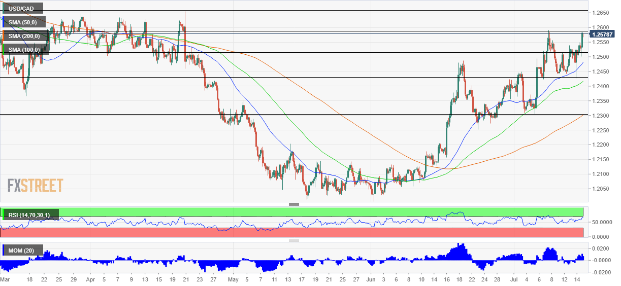- USD/CAD has extended its gains, heading toward the July high of 1.2591.