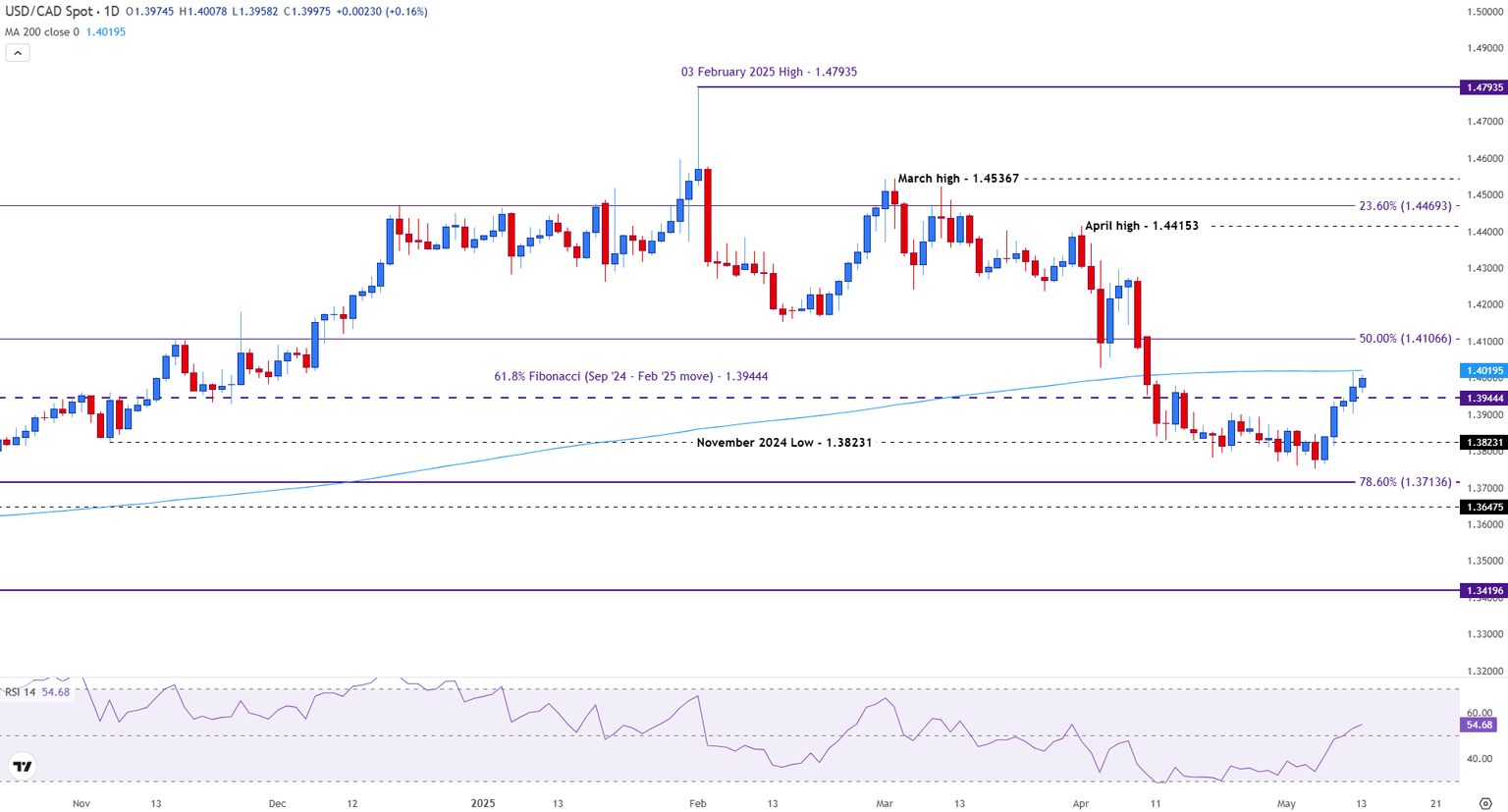 USD/CAD is poised at a critical juncture following the release of April’s US Consumer Price Index (CPI), which delivered a mild downside surprise across key inflation components. With several high-profile Federal Reserve (Fed) speeches still ahead this week, the pair's near-term trajectory may be shaped by evolving rate expectations and diverging policy signals between the Fed and the Bank of Canada (BoC).