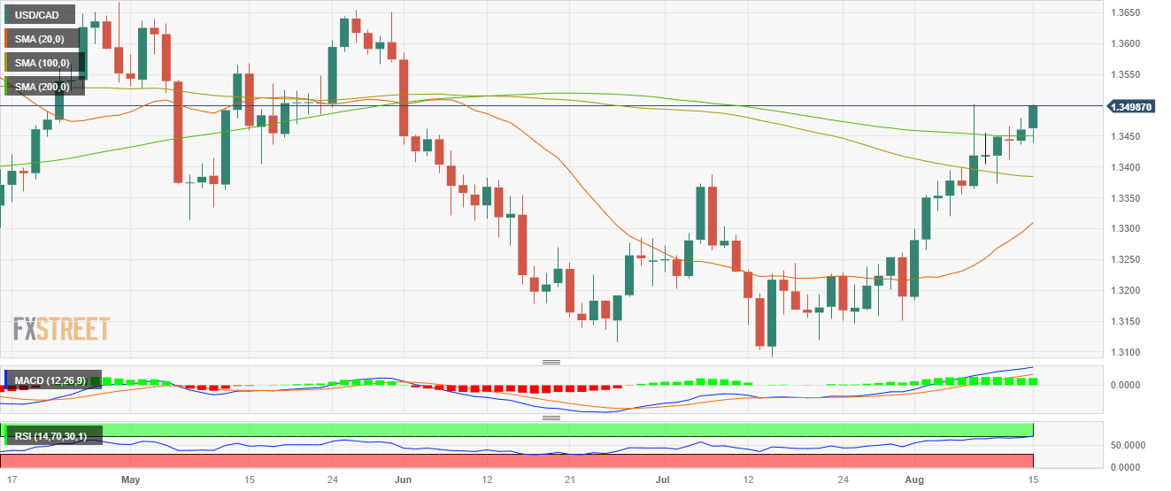 The USD/CAD saw green on Tuesday and increased near highs since early June, trading around 1.3500. On the one hand, the optimistic US Retail Sales from July made the market discount a more aggressive bet by the Federal Reserve (Fed) and favoured the USD. On the other hand, the Consumer Price Index (CPI) from July came in higher than expected, favouring the Canadian dollar, while lower Oil prices limited the upside potential.