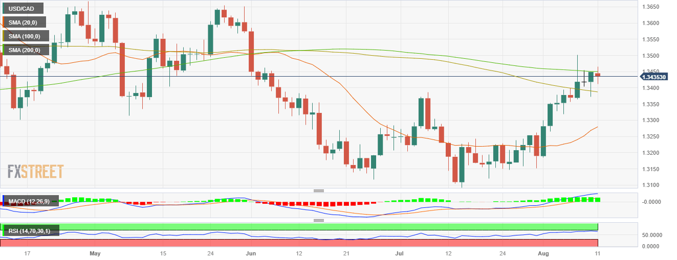 At the end of the week, the USD/CAD was rejected by the 200-day Simple Moving Average (SMA) at 1.3450 and settled near 1.3430. On the one hand, the USD is trading mildly stronger after hot Producer Price Index (PPI) from July figures which fueled a rise in American bond yields, while the CAD got a boost on the back of rising Oil prices.