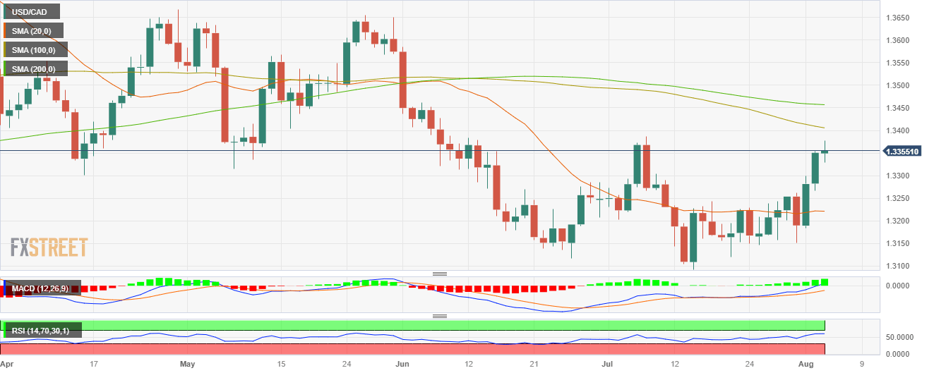 - USD/CAD peaked at a daily high of 1.3377 and then consolidated at 1.3355, still holding daily gains.