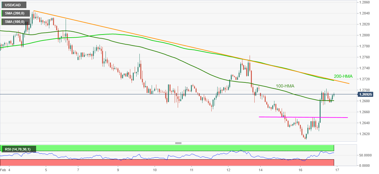 USD/CAD picks up bids around 1.2690 while trying to extend the previous day’s upside momentum during the initial Asian session on Wednesday. In doing so, the quote holds above 100-HMA amid the strong RSI conditions.