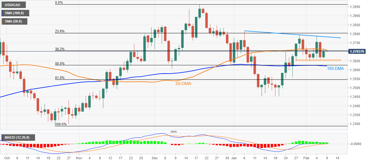 A convergence of the 50-DMA and 38.2% Fibonacci retracement (Fibo.) of October-December 2021 upside challenges the USD/CAD pair’s immediate upside around 1.2710.