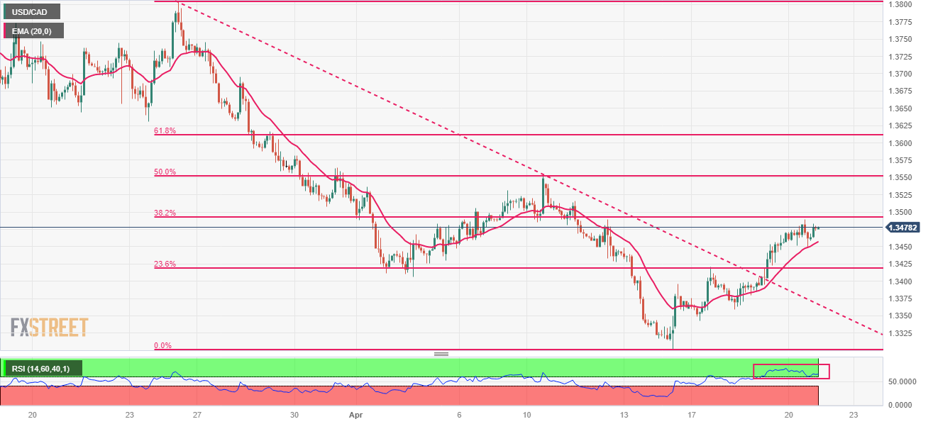 USD/CAD witnessed a steep rise after breaking above the downward-sloping trendline plotted from March 24 high at 1.3804 on a two-hour scale. The Loonie asset is struggling in extending its upside journey after reaching near the 38.2% Fibonacci retracement (plotted from March 24 high at 1.3804 to April 14 low at 1.3300) at 1.3493.