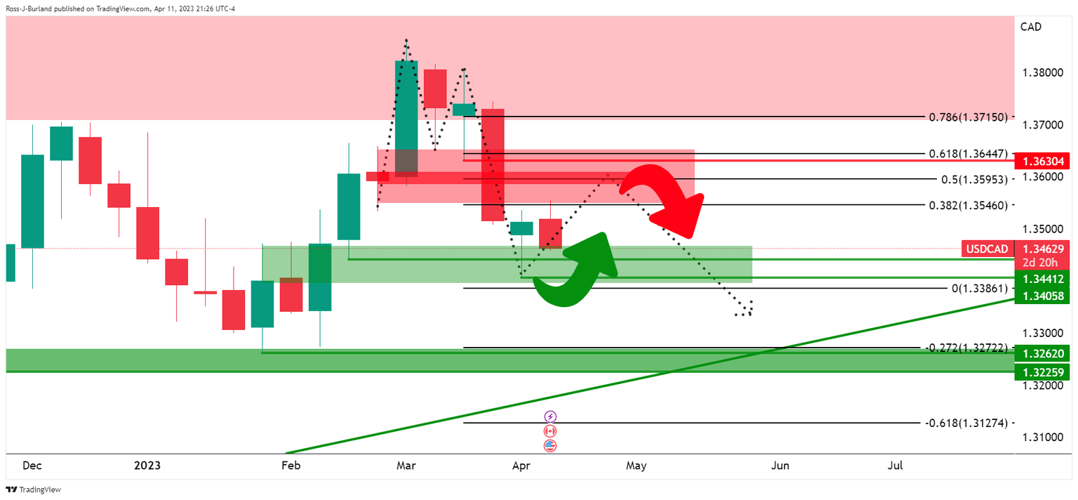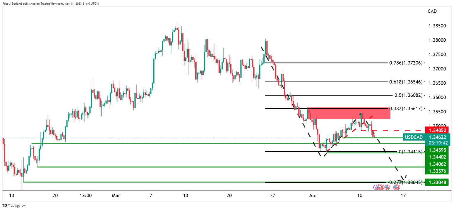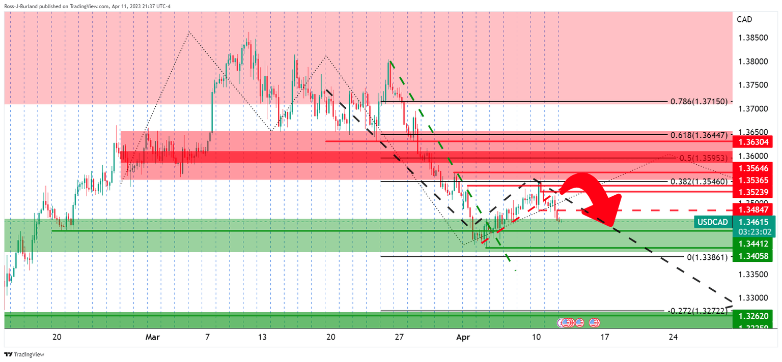 - USD/CAD bears are in the market and target the 1.3440-50s.