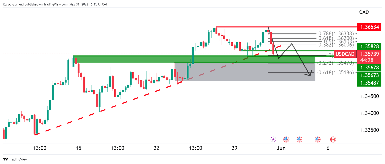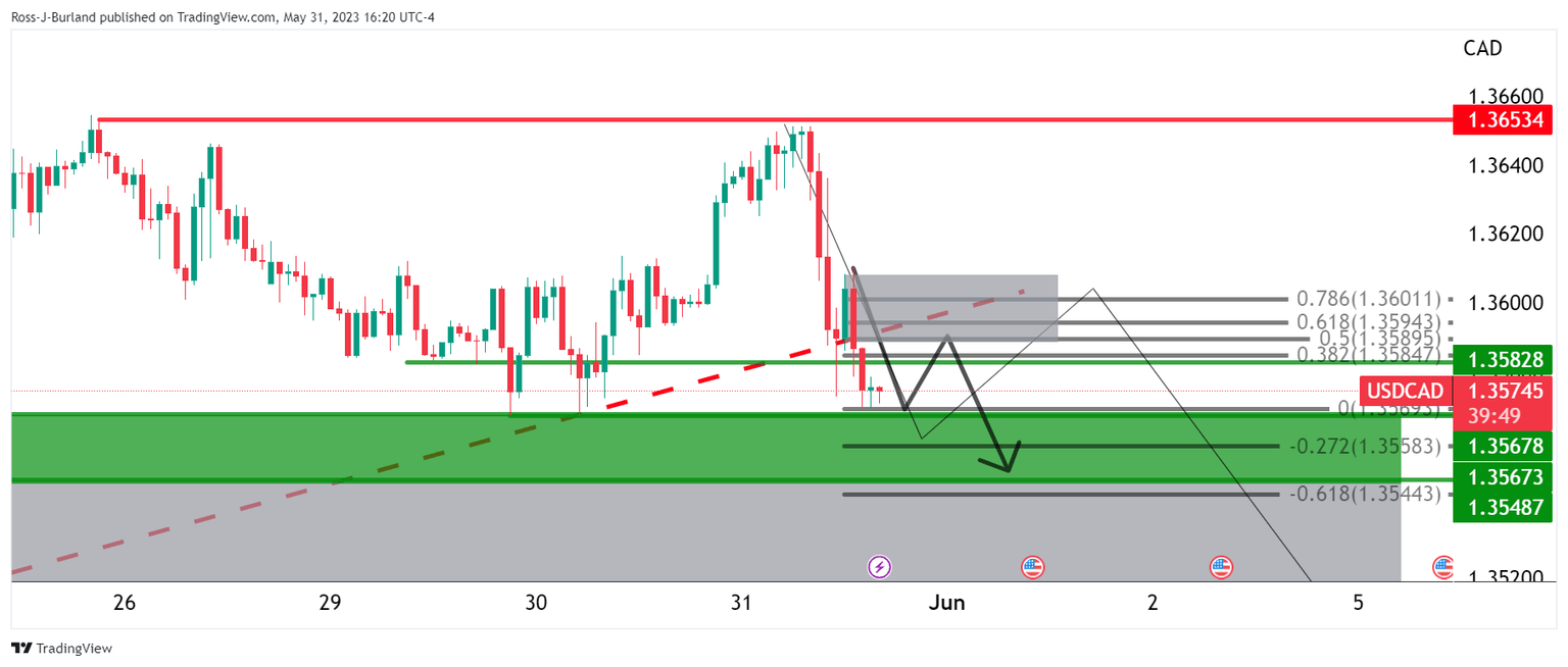 - USD/CAD bears are in the market which leaves prospects of a correction on the cards.