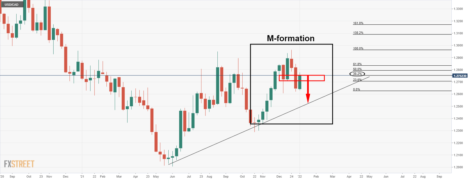 - USD/CAD bears are lurking below the counter trendlines on the weekly and daily charts.