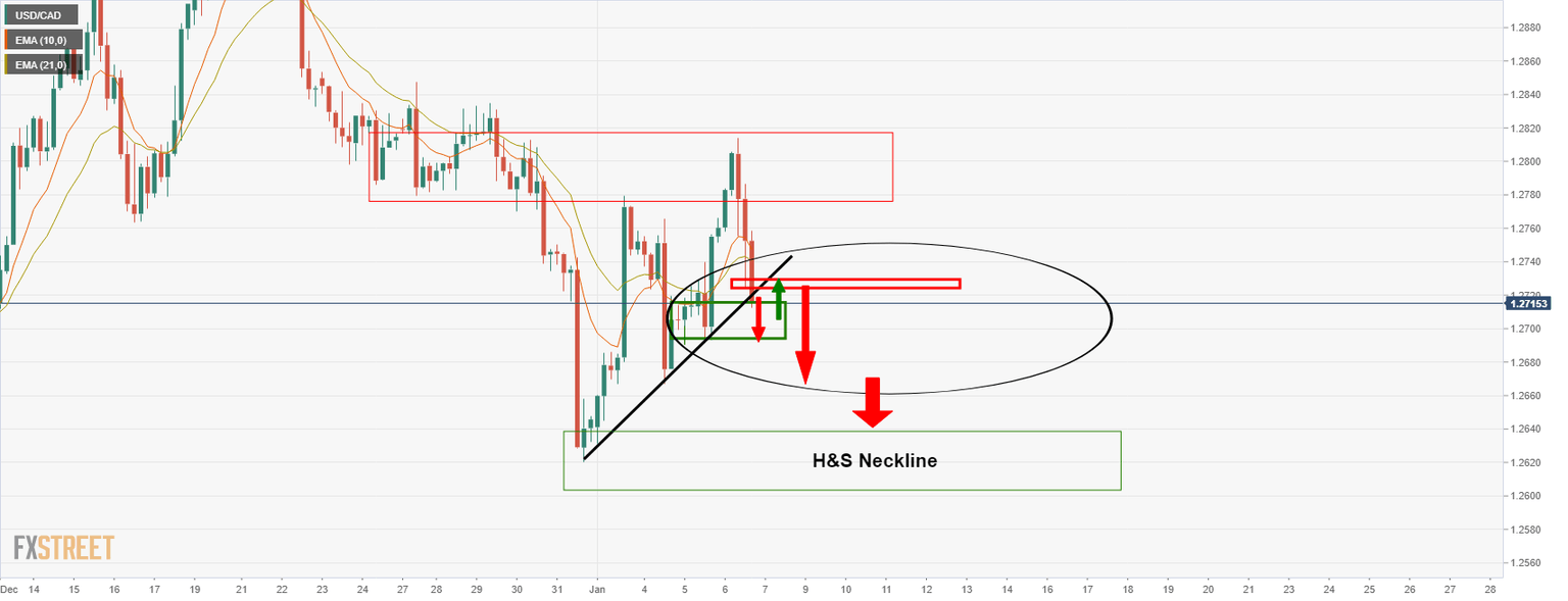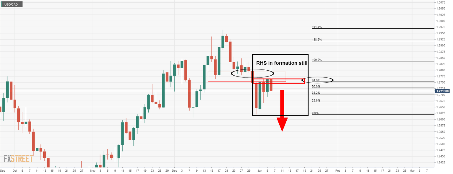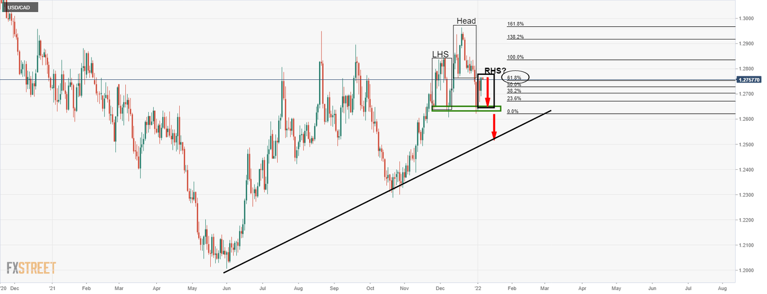 - USD/CAD is in the hands of the bears and eyes are on the daily H&S taking shape.