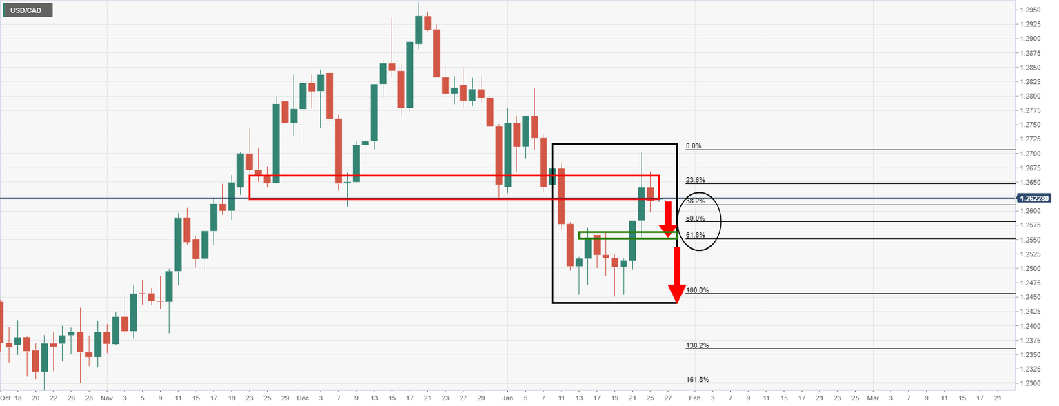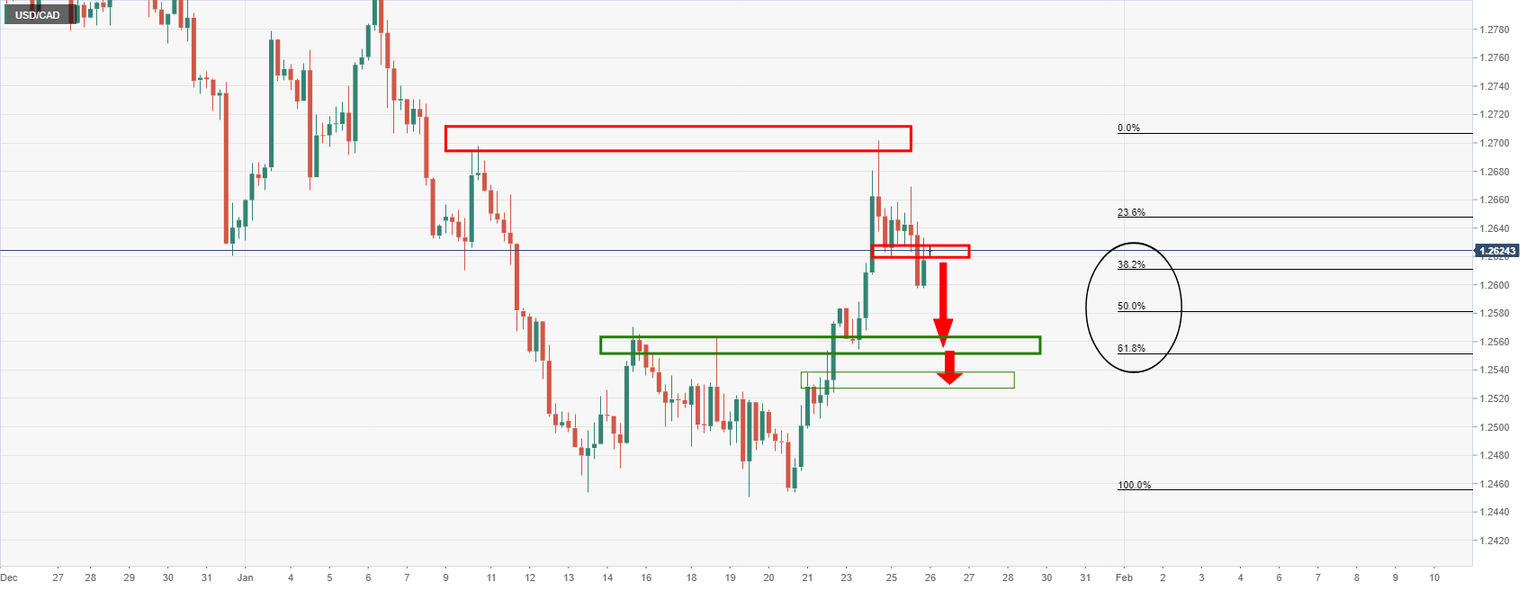 - USD/CAD bears are taking control with eyes on the Fibonacci retracement levels.