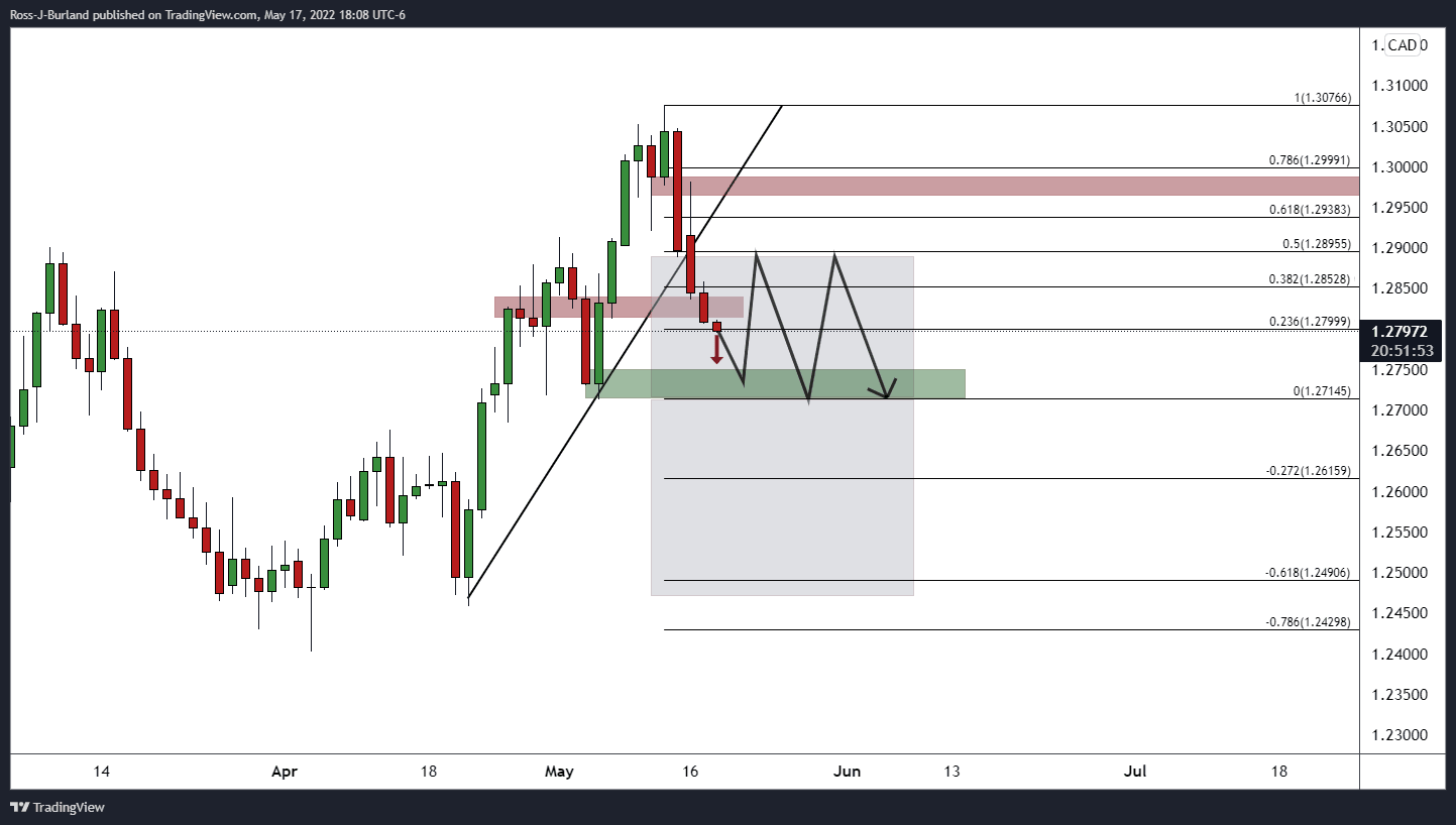 USD/CAD is moving below critical support on the charts and the pair could be in for a deeper run towards structure lower down. The following illustrates the potential price path on various time frames for the foreseeable future.