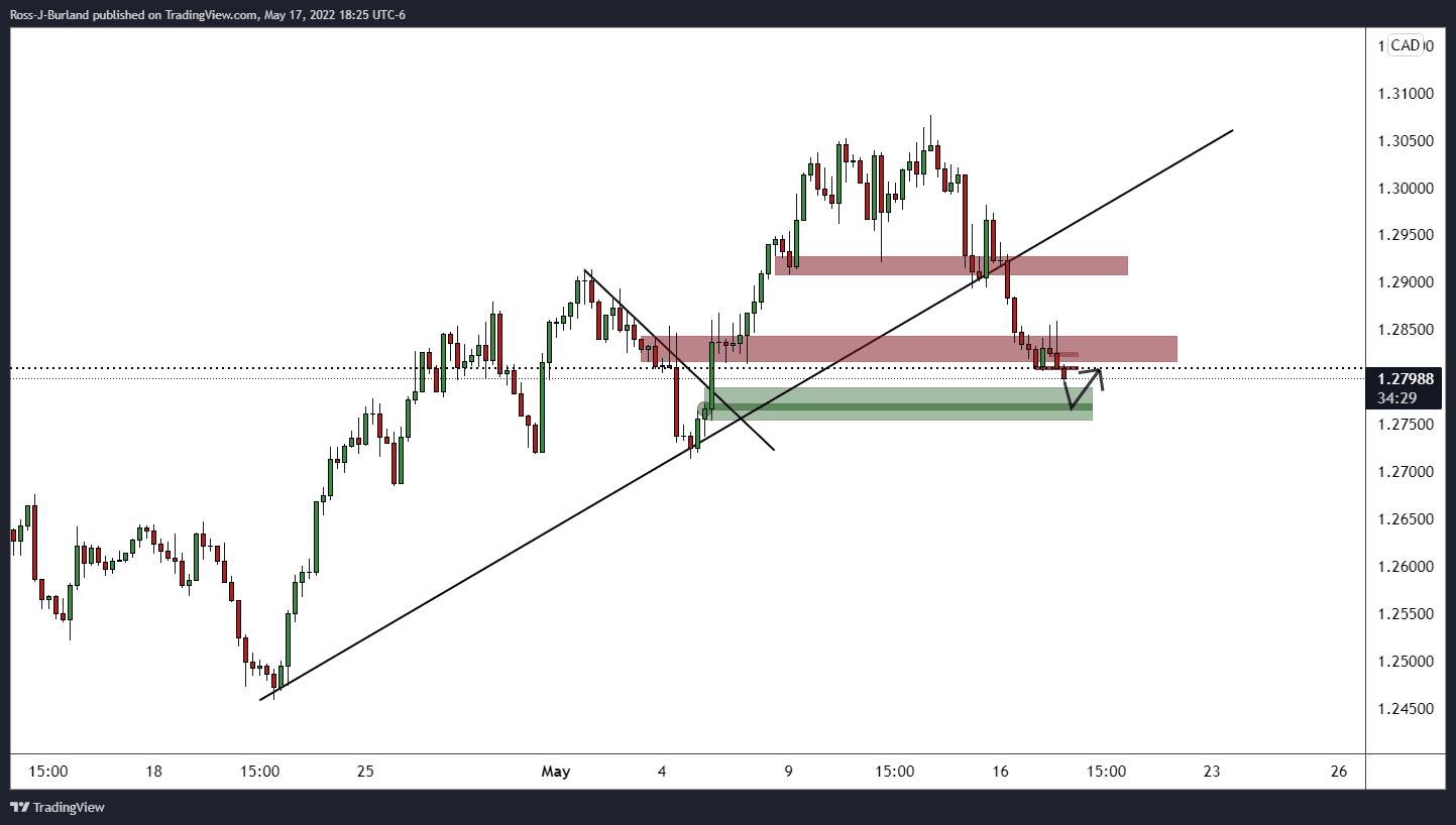 The price would be expected to meet with demand in the low 1.2700s and potentially mitigate upside territory and price imbalances over the course of the coming days between there and 1.2900 vs. the counter trendline.