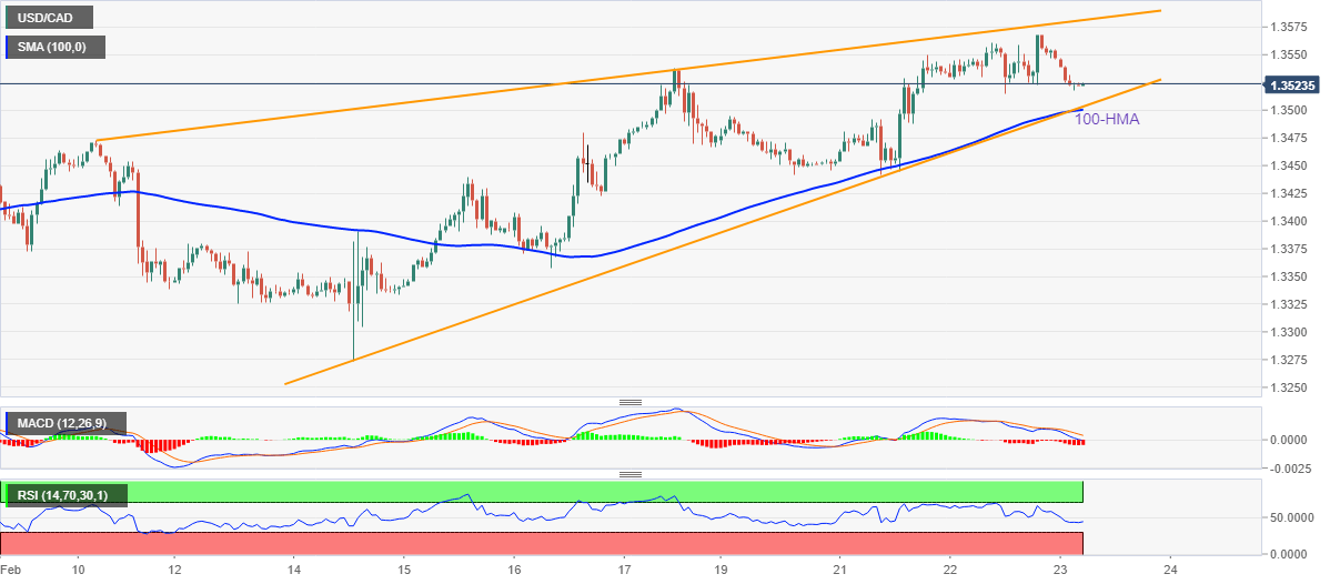 - Convergence of 100-HMA, support line of two-week-old ascending triangle restricts short-term declines of the USD/CAD pair.