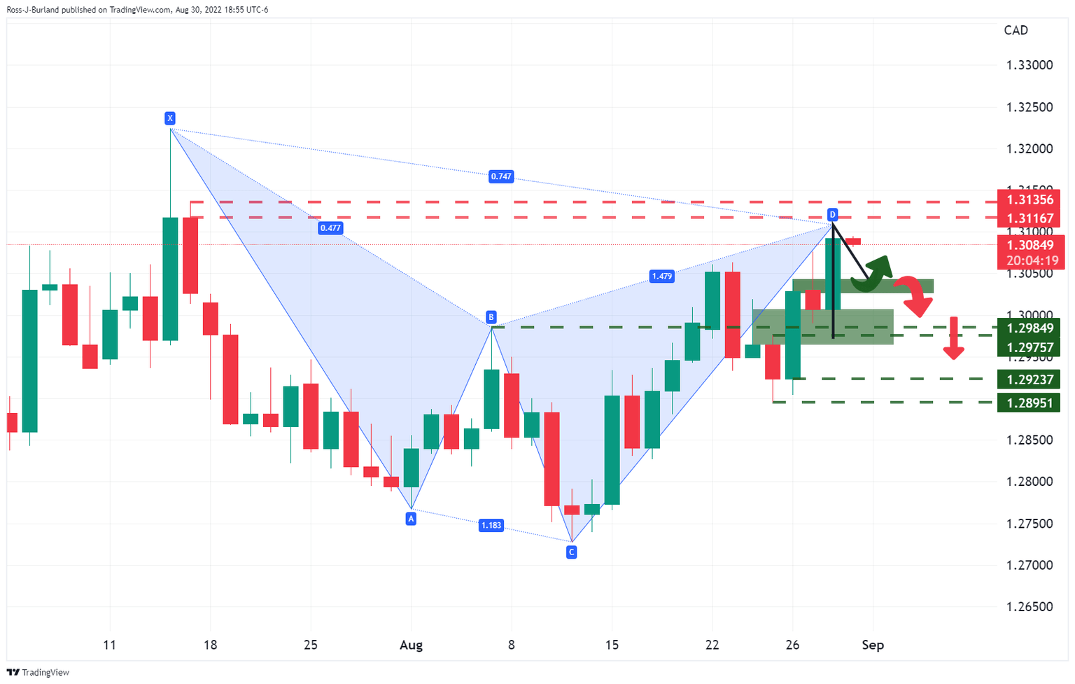 USD/CAD is decelerating on the bid which leaves the emphasis on the bearish Gartley pattern. Should the bears commit, the first area of support will be pressured to open up the prospects of a significant downside correction as the following illustrates.