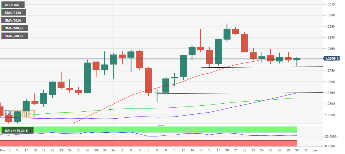 Looking at USD/CAD’s daily chart, the price has recaptured the critical 21-Daily Moving Average (DMA) at 1.2802, although needs a daily closing above the latter to confirm a bullish reversal from weekly troughs.