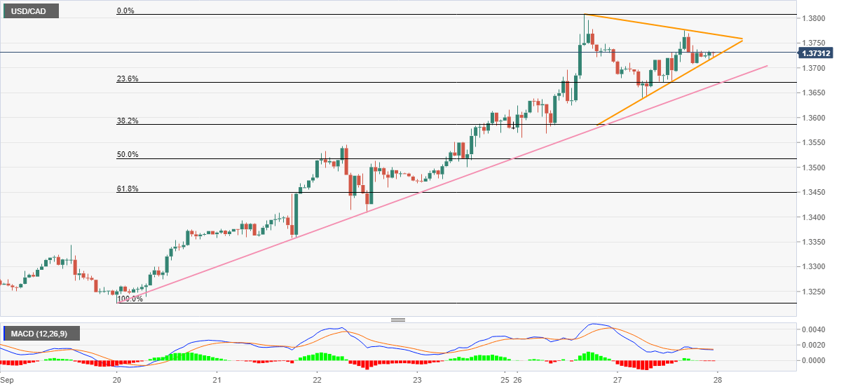 USD/CAD remains sidelined around the 27-month high marked earlier in the week, steadies near 1.3730 during Wednesday’s Asian session. In doing so, the Loonie pair portrays the trader’s indecision amid a bullish chart pattern and bearish MACD signals.