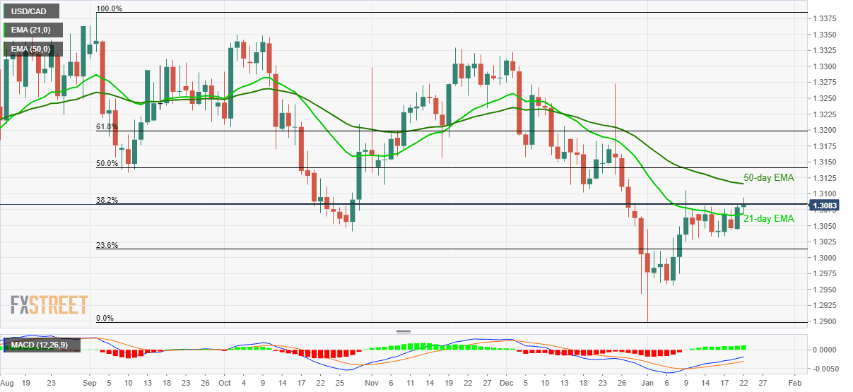 USD/CAD takes the bids near 1.3085, the highest in two weeks, during the pre-European session on Wednesday. In doing so, the pair holds on to gains after successfully breaking the 21-day EMA on a daily closing basis the previous day.