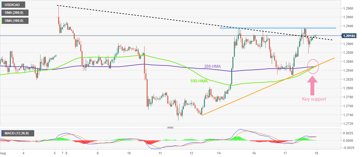 USD/CAD remains on the bull’s radar as it edges higher around 1.2920 during Thursday’s Asian session. In doing so, the Loonie pair seesaws near a downward sloping resistance line from Monday amid an impending bear cross on the MACD.