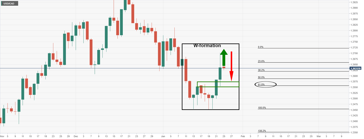 - USD/CAD bears looking for a strong correction to the neckline of the W-formaiton.