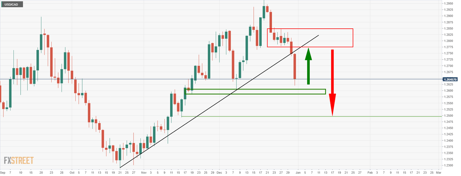 USD/CAD fell below a critical support zone during the holiday thin markets which leave a bearish bias on the charts. However, there are prospects of a bullish correction and the following illustrates the prospects for price action in the opening sessions of the week.
