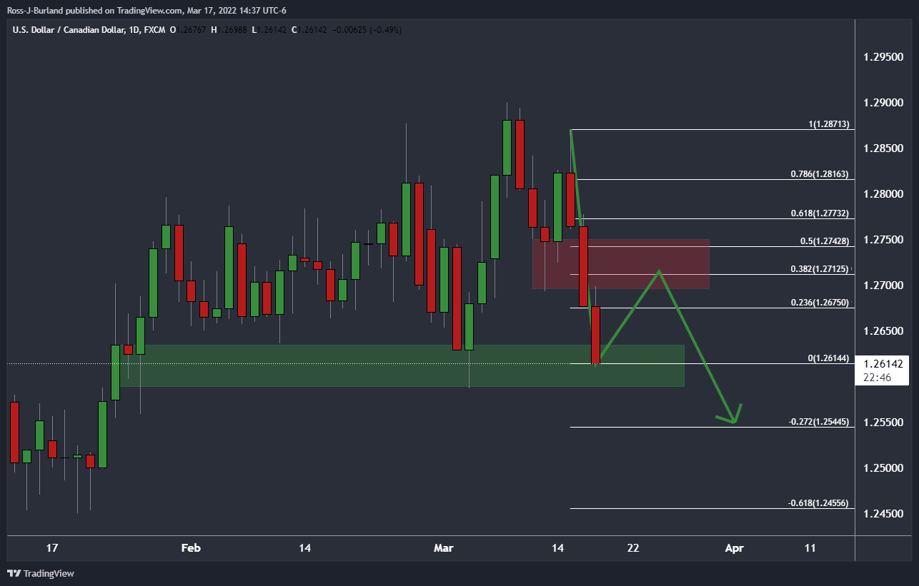 USD/CAD's M-formation is a compelling feature on the daily chart as the price moves in on a key area of what could be a demand area.