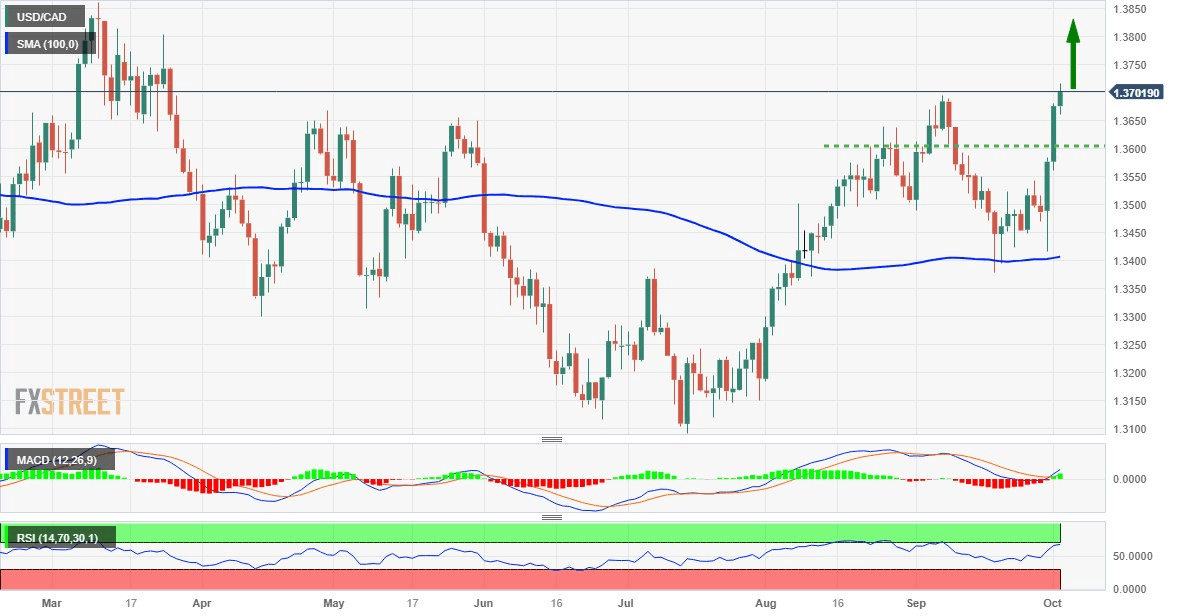 From a technical perspective, the recent solid rebound from the vicinity of the 100-day Simple Moving Average (SMA), around the 1.3400 mark, and the subsequent move up favours bullish traders. Moreover, oscillators on the daily chart are holding in the positive territory and are still far from being in the overbought zone. This, in turn, suggests that the path of least resistance for the USD/CAD pair is to the upside. Some follow-through buying beyond the daily high, around the 1.3715 area, will reaffirm the constructive outlook.