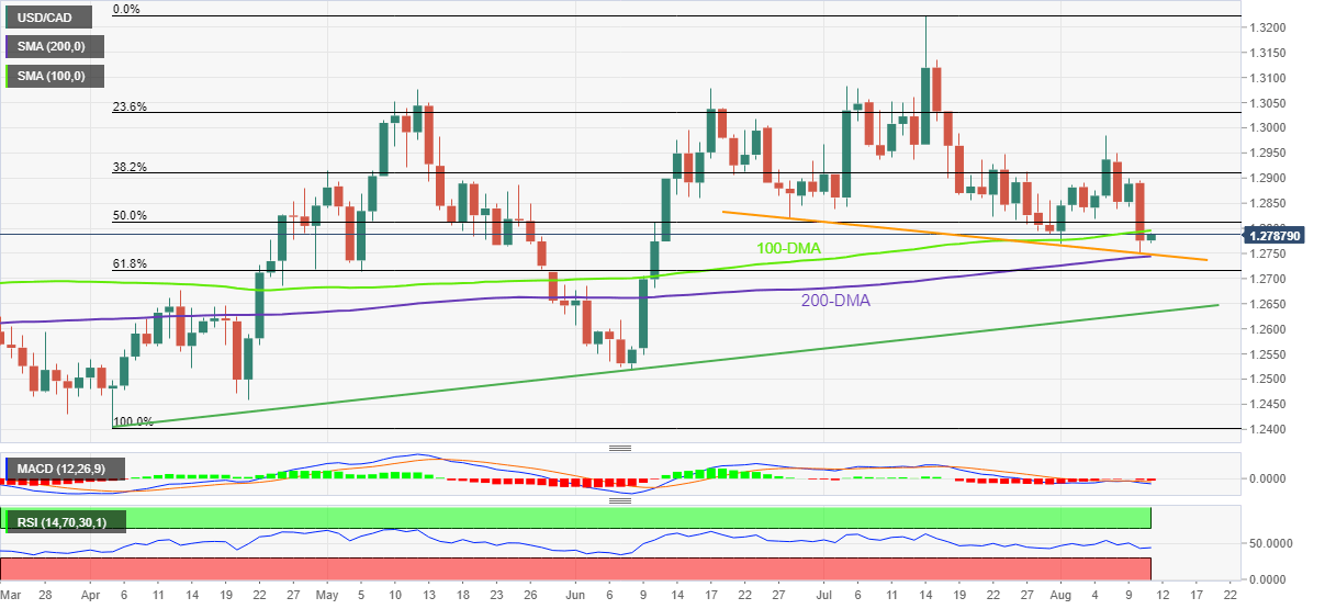USD/CAD grinds higher around the daily top as it pares the biggest daily slump since June near 1.2790 during early Thursday morning in Europe.