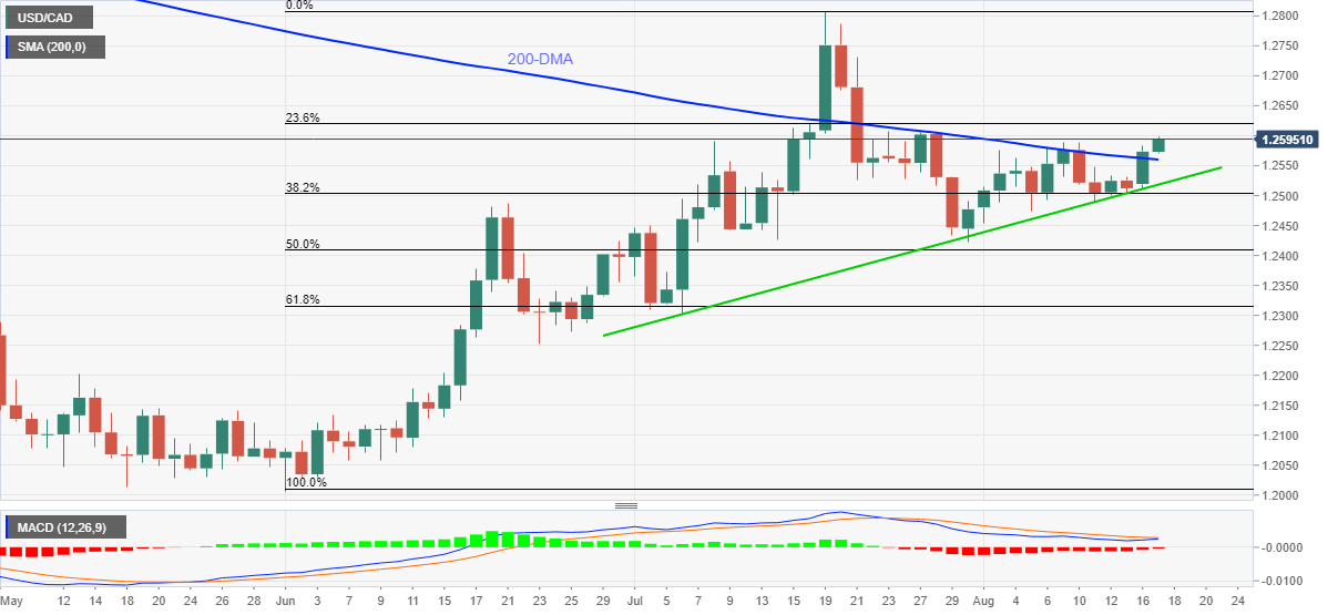 USD/CAD extends the previous day’s rebound from the key support line beyond 200-DMA during early Tuesday. In doing so, the Loonie pair takes the bids around the 1.2600 threshold to renew the highest levels since July 28.