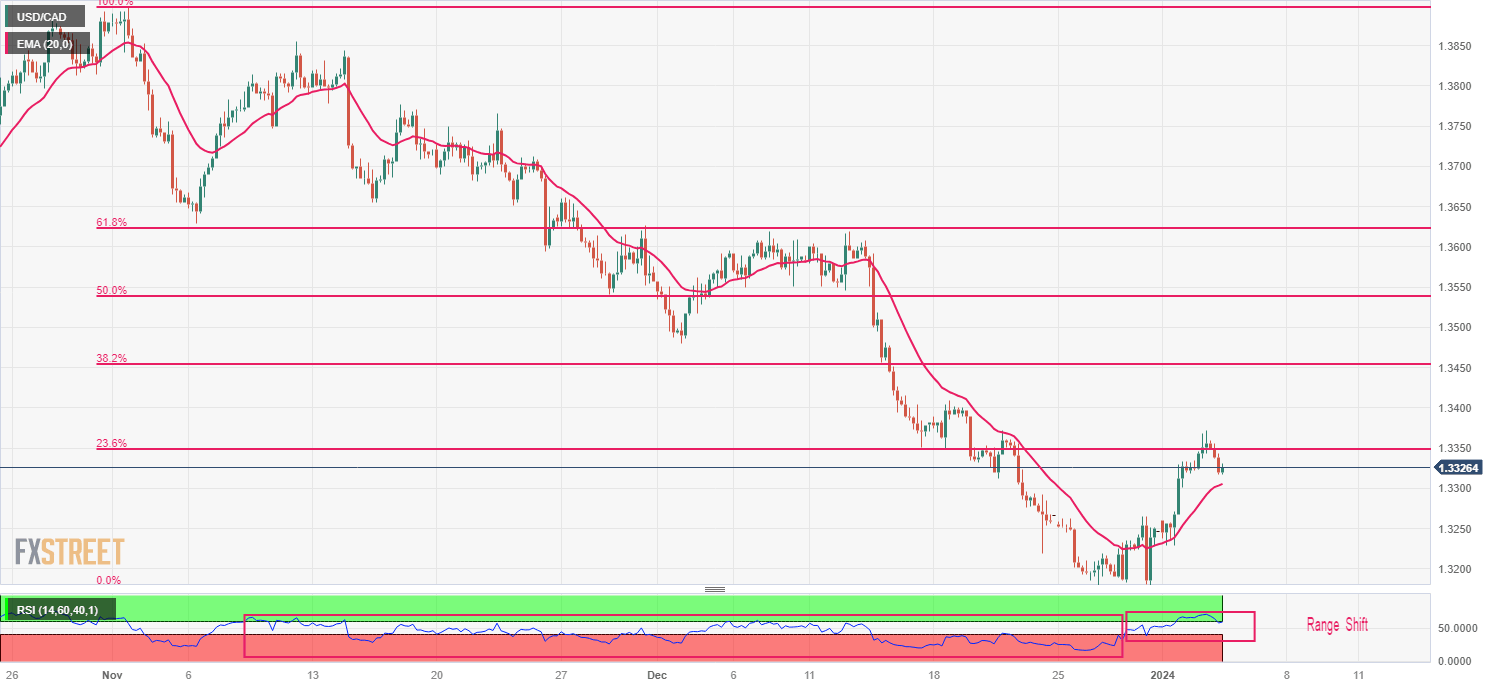 USD/CAD struggles to climb above the 23.6% Fibonacci retracement (plotted from 1 November 2023 high at 1.3900 to 27 December 2023 low at 1.3177) at 1.3350. The asset may find an intermediate support near the 20-period Exponential Moving Average (EMA), which currently trades around 1.3306.