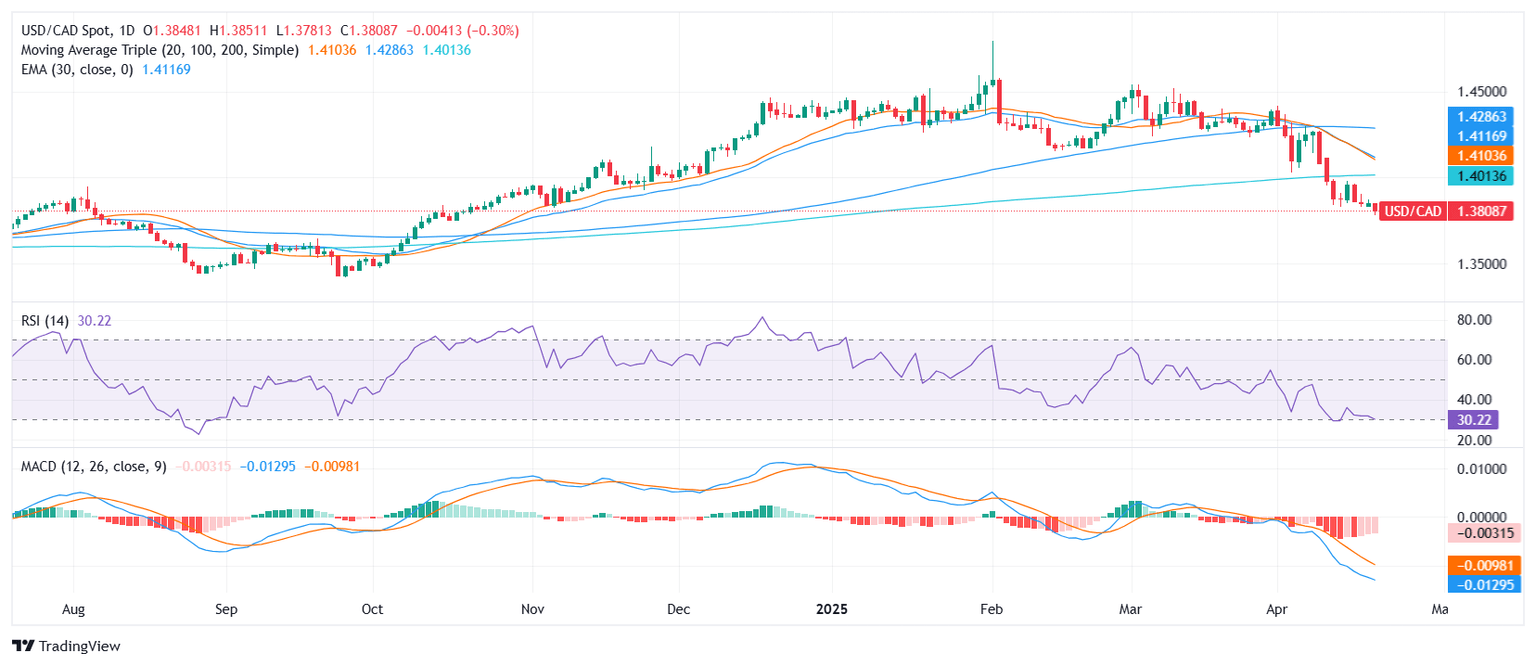 On the technical front, USD/CAD shows a bearish overall structure. Price action holds within the 1.3781–1.3852 daily range. The Relative Strength Index (RSI) reads 31, suggesting neutral momentum with a bearish tilt as it sits in the oversold threshold. The Moving Average Convergence Divergence (MACD) is flashing a sell signal, echoed by a negative Momentum (10) reading of -0.0444. Although the Awesome Oscillator remains neutral at -0.0346, the weight of the short- and long-term moving averages underscores the downside bias.