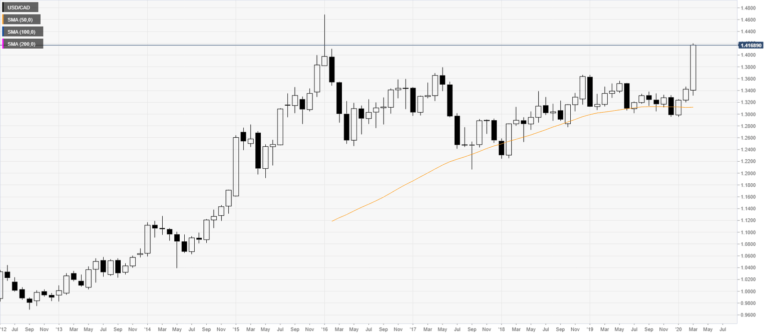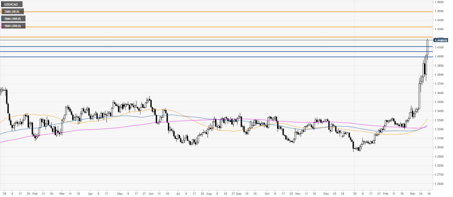 USD/CAD is soaring to levels not seen since January 2016 as the quote broke above 1.4000 figure. The oil collapse is driving the Canadian dollar down and USD/CAD up. Additionally, broad-based USD strength is pushing the currency pair higher.