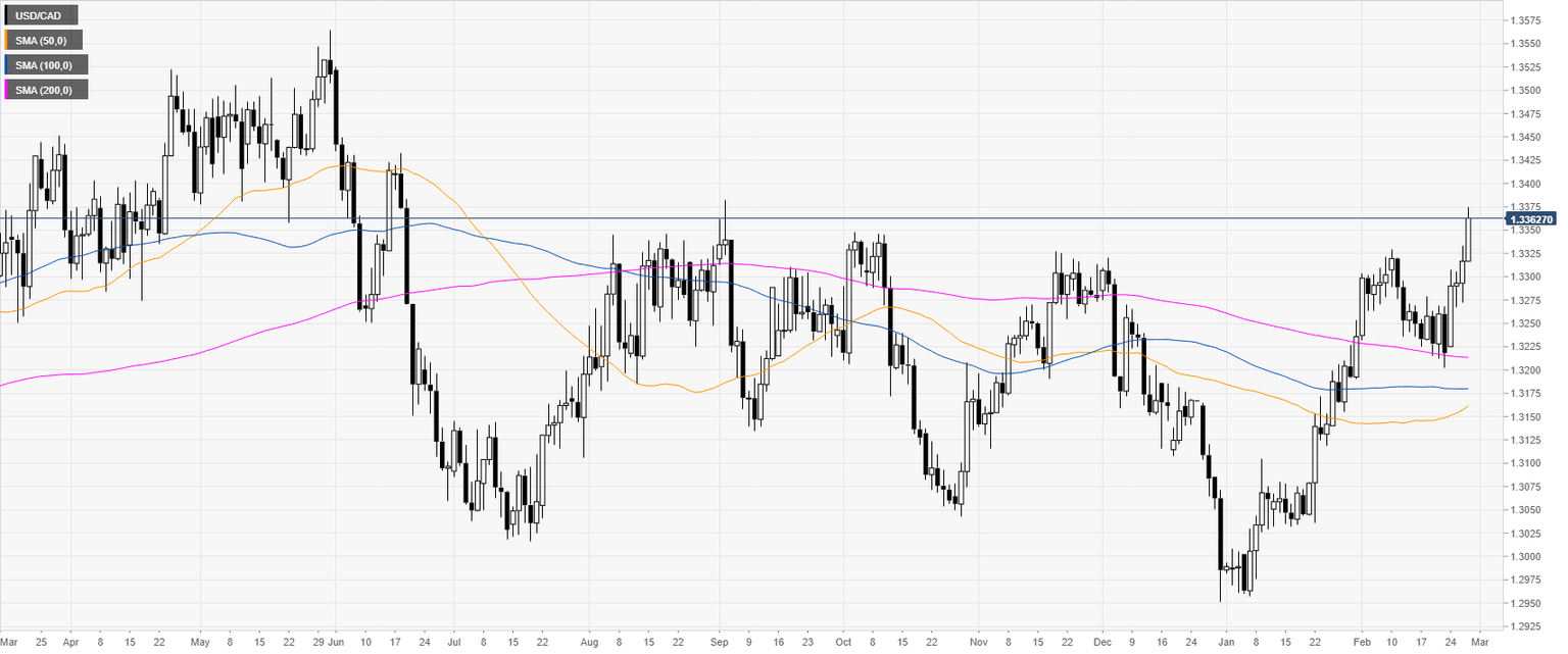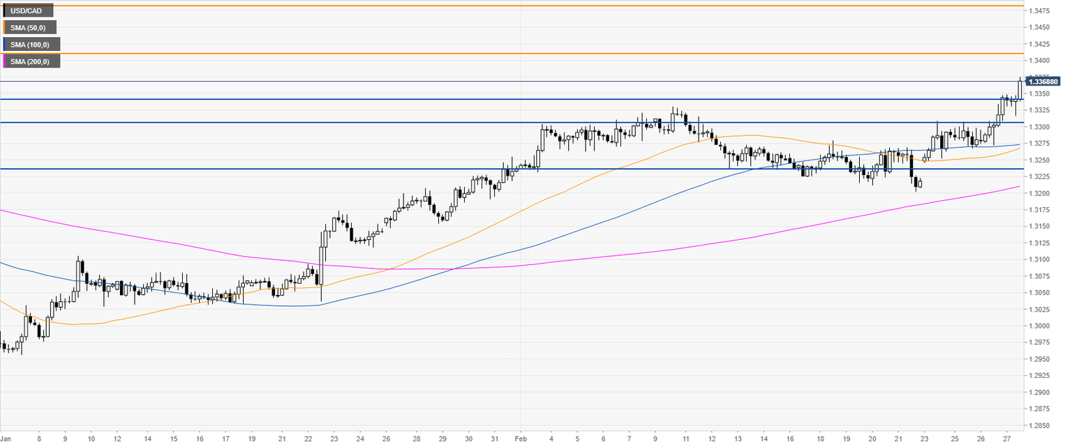 USD/CAD is marching north while hitting fresh 2020 highs as the market is above the main SMAs. As the path of least resistance is up, the market is set to continue to appreciate on a break above the 1.3410 resistance towards the 1.3487 and 1.3550 levels, according to the