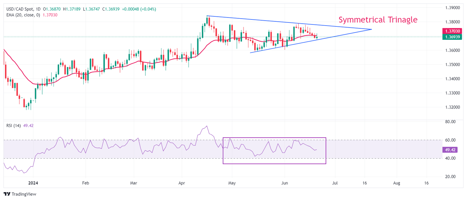USD/CAD trades in a Symmetrical Triangle chart pattern, which indicates a sharp volatility contraction. Spot prices remain sticky to the 20-day Exponential Moving Average (EMA) near 1.3700, indicating a sideways trend.