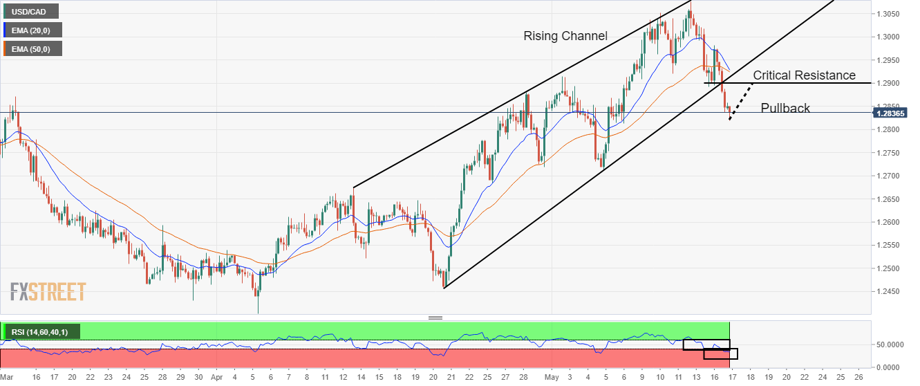 The USD/CAD pair is displaying back and forth moves in a narrow range of 1.2820-1.2846 in the Asian session followed by a sheer downside move. The greenback bulls have faced intense selling pressure after the asset failed to sustain above the psychological support of 1.3000.